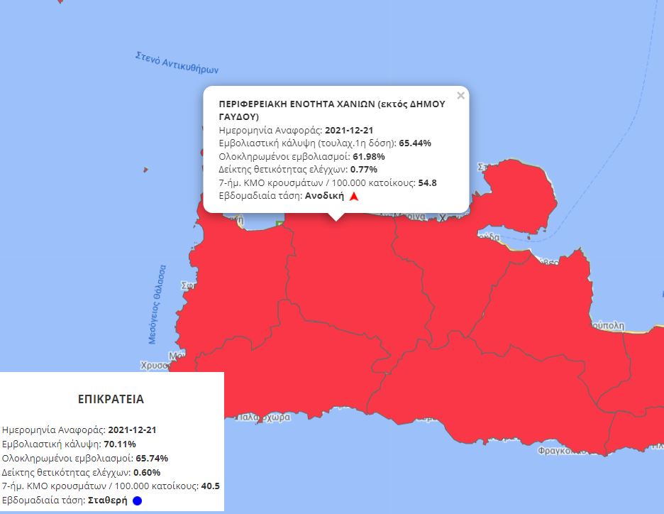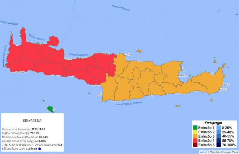 Στο «κόκκινο» βρίσκεται και το Ρέθυμνο, ενώ στο πορτοκαλί παραμένουν το Ηράκλειο και το Λασίθι.