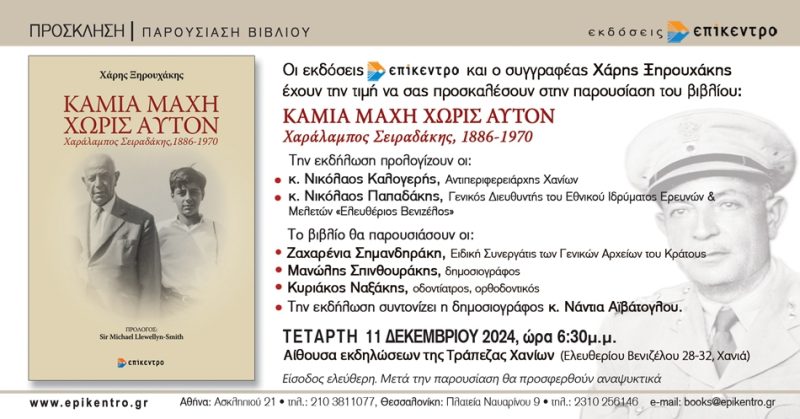 Την Τετάρτη 11 Δεκεμβρίου, στις 6:30 μ.μ. οι εκδόσεις Επίκεντρο και ο συγγραφέας Χάρης Ξηρουχάκης διοργανώνουν την παρουσίαση του βιβλίου, με τίτλο: «Καμία Μάχη Χωρίς Αυτόν. Χαράλαμπος Σειραδάκης, 1886 – 1970» στην Αίθουσα εκδηλώσεων της Τράπεζας Χανίων (Ελευθερίου Βενιζέλου 28-32, Χανιά).