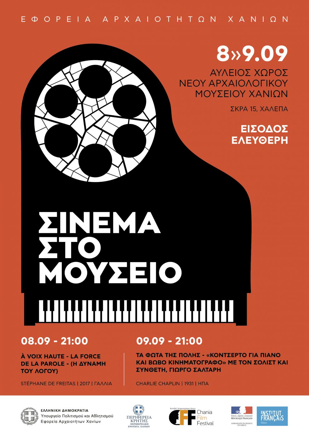 Η Εφορεία Αρχαιοτήτων Χανίων, σε συνεργασία με το Φεστιβάλ Κινηματογράφου Χανίων και την Περιφερειακή Ενότητα Χανίων-Περιφέρεια Κρήτης, διοργανώνει στο νέο Αρχαιολογικό Μουσείο Χανίων ένα ιδιαίτερο κινηματογραφικό διήμερο (8 & 9 Σεπτεμβρίου) με τίτλο ΣΙΝΕΜΑ ΣΤΟ ΜΟΥΣΕΙΟ.