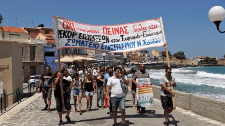 Τη διασφάλιση των θέσεων εργασίας τους ζήτησαν σήμερα εργαζόμενοι στο χώρο του τουρισμού στα Χανιά, που πραγματοποίησαν συγκέντρωση έξω από το Εργατικό Κέντρο της πόλης και πορεία προς την Αντιπεριφέρεια όπου και παρέδωσαν ψήφισμα με τα αιτήματα τους.