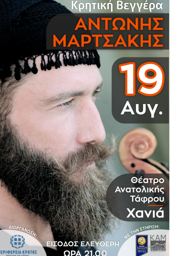 Η Περιφέρεια Κρήτης – Περιφερειακή Ενότητα Χανίων διοργανώνει την Τετάρτη 19 Αυγούστου, ώρα 21.00, στο Θέατρο Ανατολικής Τάφρου στα Χανιά, την «Κρητική Βεγγέρα» με τον Αντώνη Μαρτσάκη.