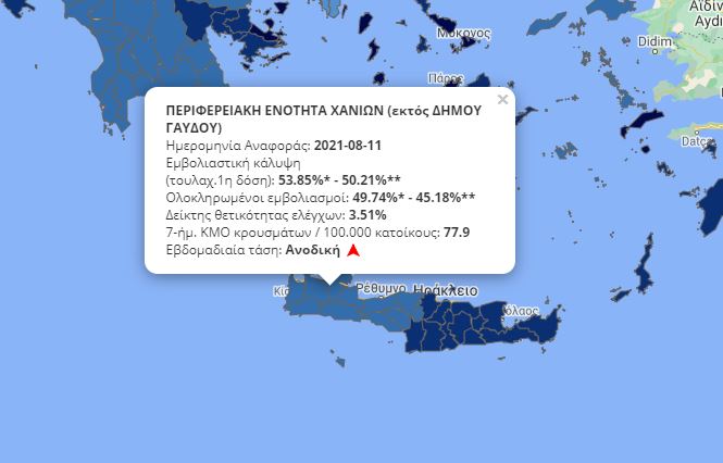Στα Χανιά, στις 12 Αυγούστου είχαν γίνει μόλις 554 εμβολιασμοί, εκ των οποίων οι 129 ήταν με την πρώτη δόση και οι 439 με τη δεύτερη. Οι πλήρως εμβολιασμένοι σε όλο τον νομό είναι 86.473.
