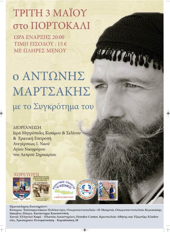 Φιλότιμα και ευγενώς προσφέρθηκαν: ο καταξιωμένος καλλιτέχνης κ. Αντώνης ΜΑΡΤΣΑΚΗΣ με το συγκρότημα του, η διεύθυνση του Κέντρου «ΠΟΡΤΟΚΑΛΙ» και οι Παραδοσιακοί Σύλλογοι: Παραδοσιακός Σύλλογος Χανίων «ΒΙΓΛΑΤΟΡΕΣ», Μορφωτικός-Πολιτιστικός Σύλλογος «Ο ΓΗΓΕΝΗΣ», Χορευτικός Σύλλογος «Η ΚΙΣΑΜΟΣ», Αθλητικός-Χορευτικός Σύλλογος «ΟΙ ΠΕΛΑΣΓΟΙ», ως και ο ΟΜΙΛΟΣ ΒΡΑΚΟΦΟΡΩΝ ΚΙΣΑΜΟΥ», τους οποίους και θερμά ευχαριστούμε.