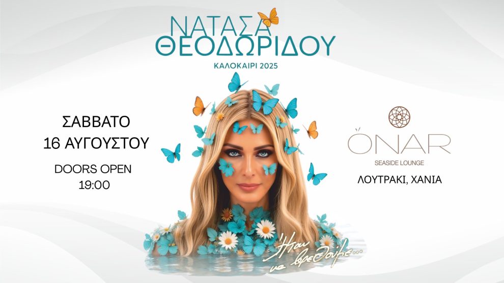 Μια μαγική μουσική βραδιά μας υπόσχεται η κορυφαία λαϊκή ερμηνεύτρια Νατάσα Θεοδωρίδου, που έρχεται στα Χανιά στις 16/08 σε μια μοναδική συναυλία δίπλα στο κύμα στο Onar Seaside Lounge στο Λουτράκι Χανίων. Ζήστε από κοντά τη συγκίνηση και τη δύναμη των τραγουδιών της. Απολαύστε ζωντανά το νέο της άλμπουμ «Ήταν να βρεθούμε», που ήδη έχει κερδίσει τις καρδιές του κοινού. Ταξιδέψτε με τις μεγάλες επιτυχίες που όλοι αγαπήσαμε! Τη βραδιά πλαισιώνει ο ταλαντούχος Χρήστος Τσιλόπουλος, με δυναμική παρουσία στη σκηνή.