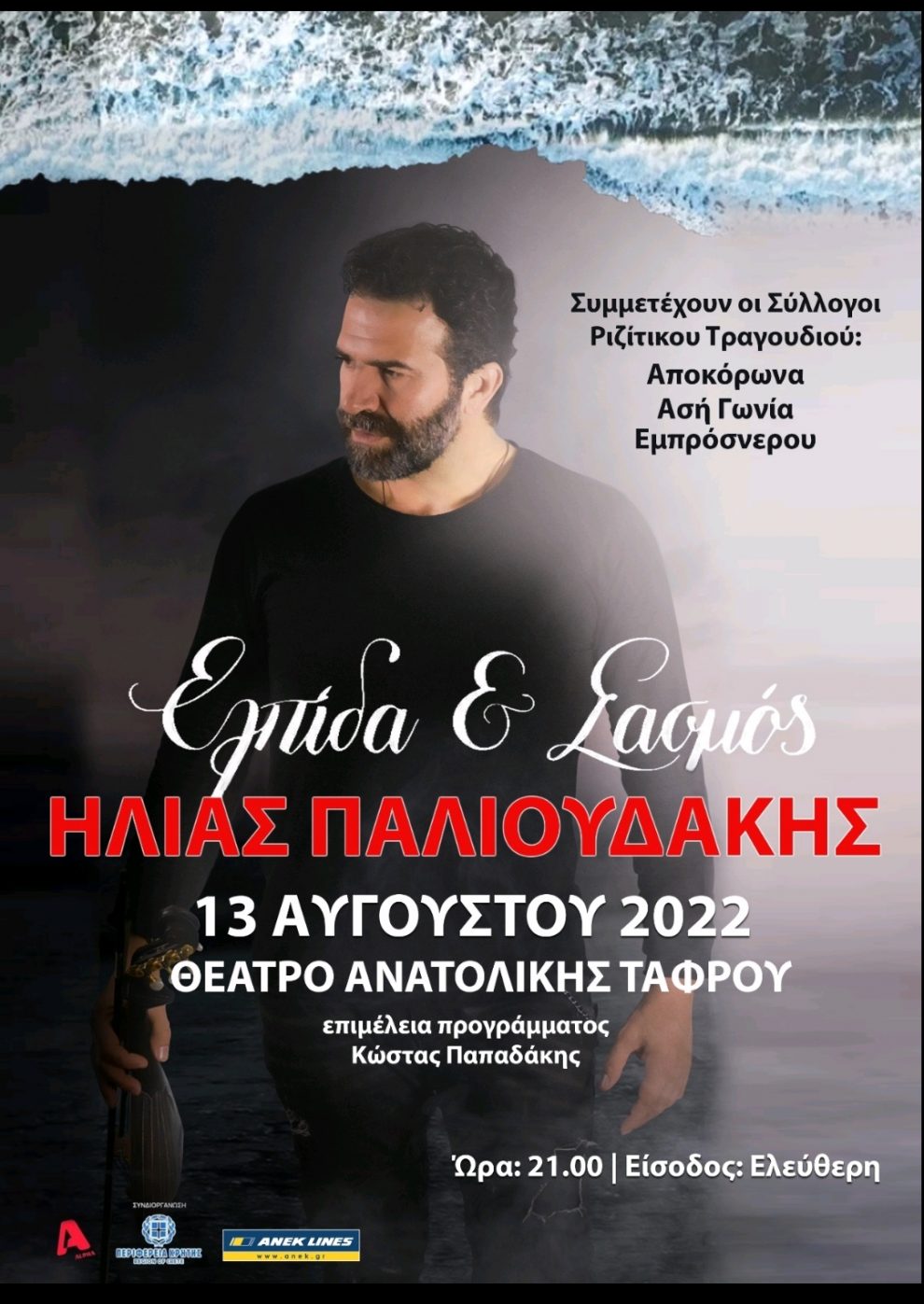 θα τον απολαύσουμε.. Το Σάββατο 13 Αυγούστου στα Χανιά στο θέατρο της Ανατολικής Τάφρου. Τα τραγούδια του αγαπημένα, η ερμηνεία του ανατριχιαστική ο Ηλίας Παλιουδάκης μας ταξιδεύει σε ένα ταξίδι με μελωδίες, μουσικές, εικόνες και συναισθήματα. Το πάθος του στην σκηνή σε μαγνητίζει τον ακούς και να τον βλέπεις σιγοτραγουδώντας τα τραγούδια του, ξυπνώντας μας μνήμες και συγκινώντας μας με την μοναδική του φωνή και την επιβλητική παρουσία, παρέα με το άλλο του μισό την λύρα».