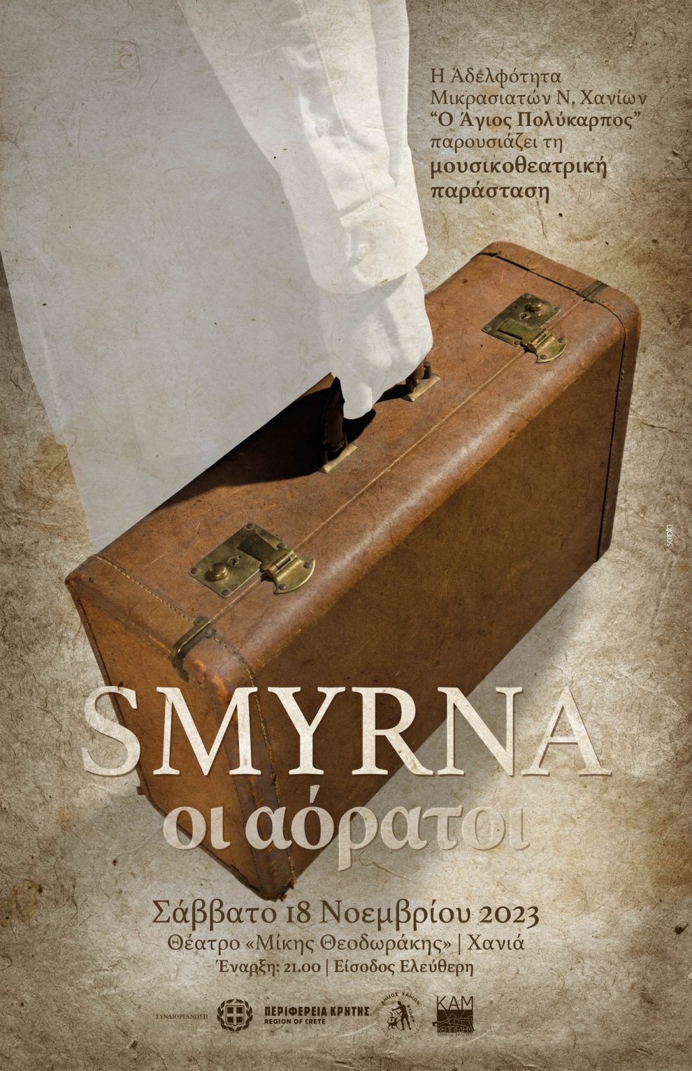 Η Περιφέρεια Κρήτης – Περιφερειακή Ενότητα Χανίων, ο Δήμος Χανίων, η ΚΕΠΠΕΔΗΧ – ΚΑΜ και η Αδελφότητα Μικρασιατών Ν. Χανίων «Ο Άγιος Πολύκαρπος», συνδιοργανώνουν τη Μουσικοθεατρική Παράσταση «SMYRNA. οι αόρατοι», το Σάββατο 18 Νοεμβρίου, ώρα 21.00, στο Θέατρο «Μίκης Θεοδωράκης».