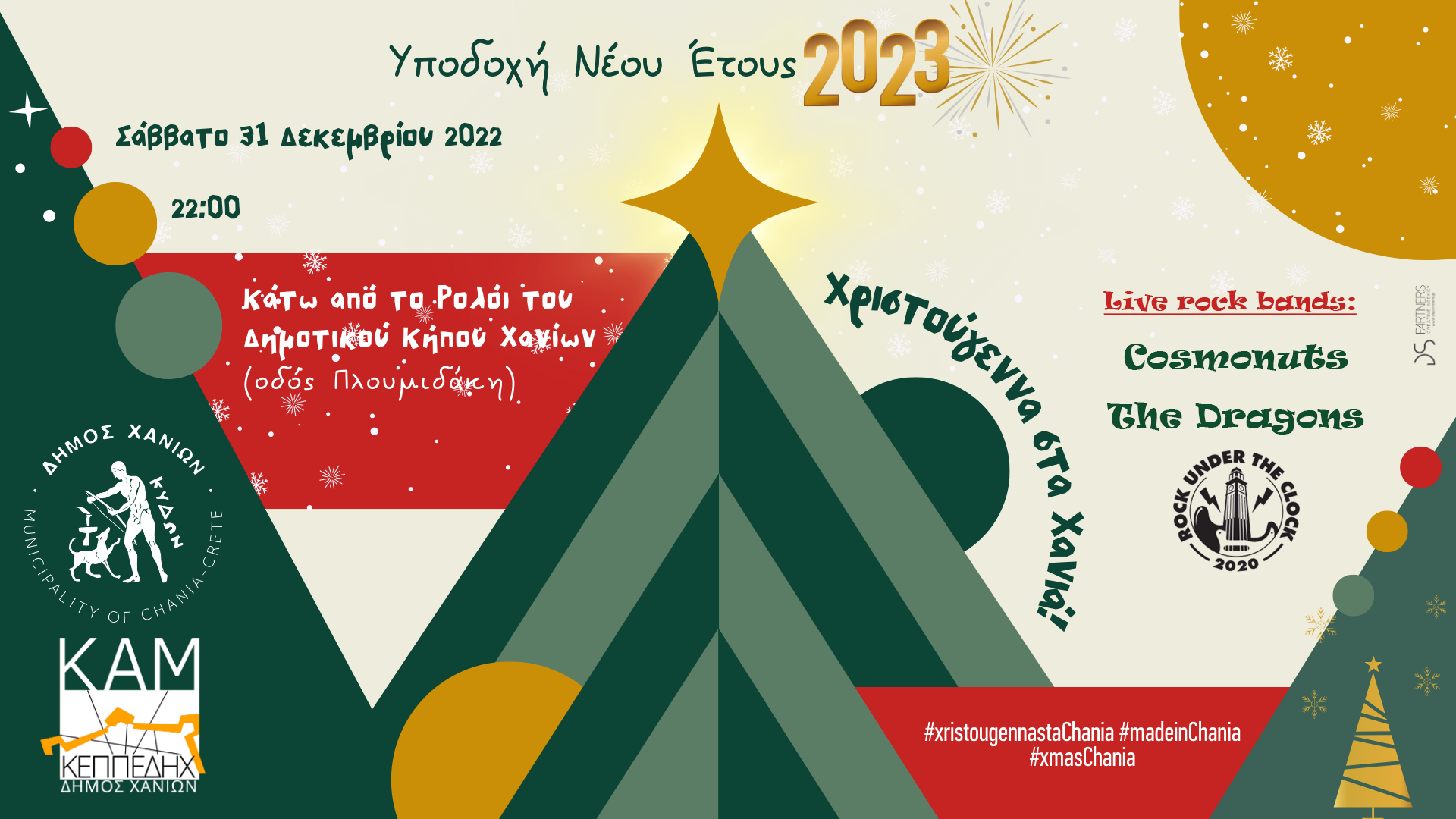 Μετά από δύο χρονιές με περιορισμούς, ο Δήμος Χανίων και η Κοινωφελής του Επιχείρηση Πολιτισμού και Περιβάλλοντος (Κ.Ε.Π.ΠΕ.ΔΗ.Χ.-Κ.Α.Μ.), μας προσκαλούν όλους σε μια φαντασμαγορική εκδήλωση με ζωντανή μουσική από νεανικά συγκροτήματα της πόλης, ώστε να γιορτάσουμε όλοι μαζί, από κοντά, την έλευση του καινούργιου χρόνου 2023.