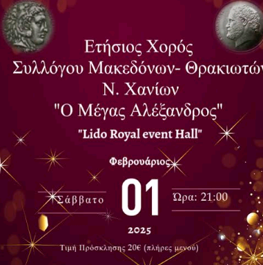 Ο Σύλλογος Μακεδόνων – Θρακιωτών Νομού Χανίων «ο Μέγας Αλέξανδρος» σας προσκαλεί να τιμήσετε με την παρουσία σας τον ετήσιο χορό του που θα γίνει το Σάββατο 1 Φεβρουαρίου 2025 και ώρα 21:00, στο κέντρο διασκέδασης «Lido Royal Event Hall» που βρίσκεται στα Τσικαλαριά Χανίων.