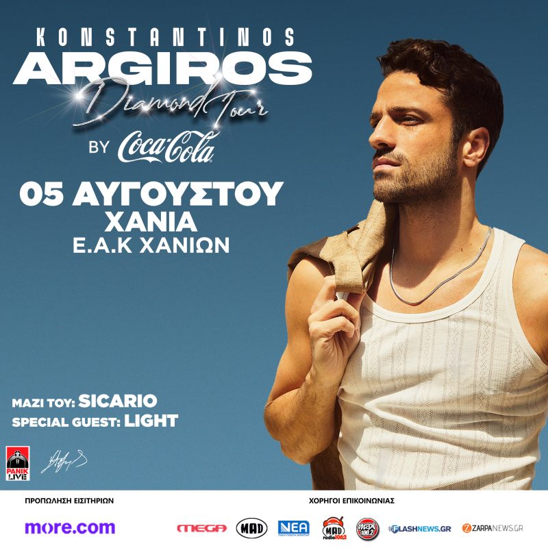 Με «όχημα» τη μουσική του, την αγαπημένη σε όλους φωνή του , την αστείρευτη ενέργειά του & τη νέα του επιτυχία «Σ’ αγαπάω γιατί» , ο Κωνσταντίνος Αργυρός έρχεται την Δευτέρα 5 Αυγουστου στο Εθνικό Αθλητικό Κέντρο Χανίων για μια μαγική βραδιά, προσφέροντας μοναδικές συγκινήσεις.
