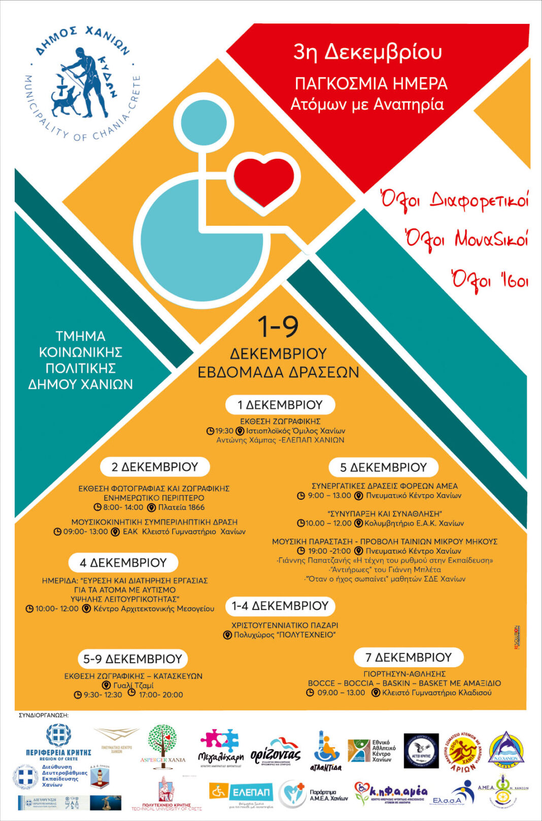 Με σύνθημα: «Όλοι διαφορετικοί, όλοι μοναδικοί, όλοι ίσοι», ξεκινούν την Πέμπτη 1η Δεκεμβρίου 2022, οι δράσεις με αφορμή την Παγκόσμια Ημέρα Ατόμων με Αναπηρία (3 Δεκεμβρίου), που διοργανώνει ο Δήμος Χανίων, σε συνεργασία με τους Συλλόγους υποστήριξης ΑμεΑ της πόλης και τις Διευθύνσεις Πρωτοβάθμιας και Δευτεροβάθμιας Εκπαίδευσης Νομού Χανίων.