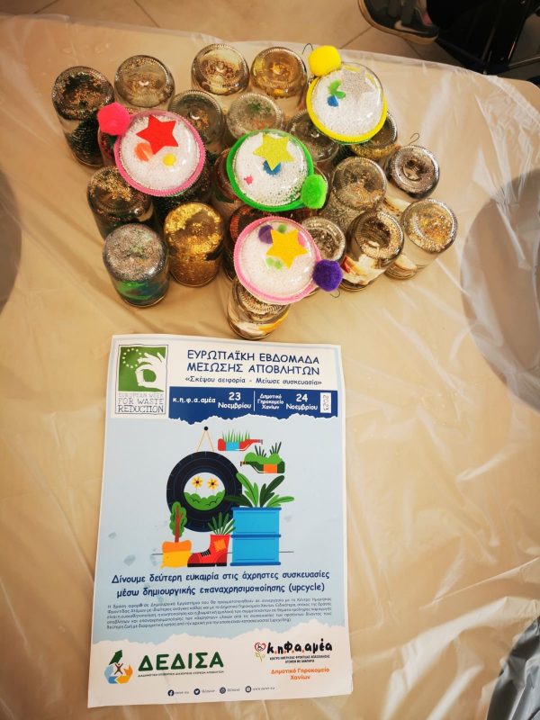 Ολοκληρώνοντας την συμμετοχή της η ΔΕΔΙΣΑ Α.Ε. (ΟΤΑ) στην Ευρωπαϊκή Εβδομάδα Μείωσης Αποβλήτων 2023 με τη δράση «Δίνουμε δεύτερη ευκαιρία στις άχρηστες συσκευασίες μέσω δημιουργικής επαναχρησιμοποίησης (upcycle)», σε συνεργασία με το Κέντρο Ημερήσιας Φροντίδας – Απασχόλησης Ατόμων με Αναπηρία (Κ.Η.Φ.Α.ΑΜΕΑ), το Δημοτικό Γηροκομείο Χανίων και τη συνδρομή του Ερυθρού Σταυρού Χανίων και των σπουδαστών Βοηθών Εργοθεραπείας του ΙΕΚ ΔΕΛΤΑ 360 Χανίων, υλοποίησε δύο δημιουργικά εργαστήρια στα οποία κατασκευάστηκαν χριστουγεννιάτικα στολίδια με υλικά τα οποία προορίζονταν για απόρριψη. Η Δράση αποσκοπούσε μέσω βιωματικής εμπλοκής των συμμετεχόντων, στην προώθηση της πρόληψης παραγωγής αποβλήτων και της επαναχρησιμοποίησης των προϊόντων δημιουργικά, μετατρέποντας τα σε νέα προϊόντα (upcycling).