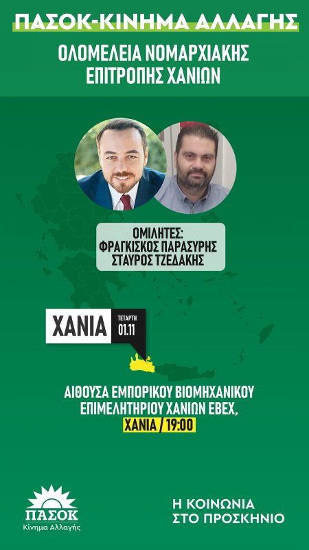 Η νομαρχιακή επιτροπή ΠΑΣΟΚ – Κινήμα Αλλαγής Χανίων καλεί όλα τα μέλη της, την Τετάρτη 1η Νοεμβρίου και ώρα 7 μ.μ. στην αίθουσα του Εμπορικού Βιομηχανικού Επιμελητηρίου Χανίων ΕΒΕΧ, για την διεξαγωγή ολομέλειας.