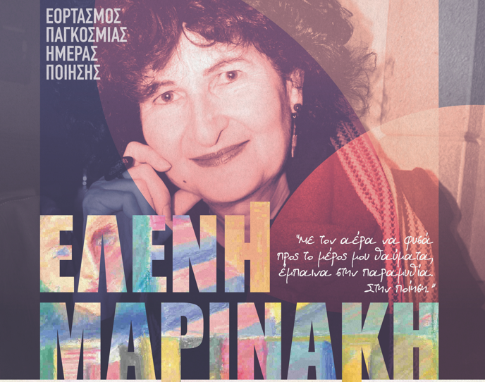 Η Περιφέρεια Κρήτης – Περιφερειακή Ενότητα Χανίων, ο Δήμος Χανίων, η Δημοτική Βιβλιοθήκη Χανίων και ο Σύνδεσμος Φιλολόγων Νομού Χανίων, με αφορμή τον εορτασμό της Παγκόσμιας ημέρας ποίησης, συνδιοργανώνουν εκδήλωση, αφιερωμένη στην ποίηση και στο έργο της Χανιώτισσας ποιήτριας Ελένης Μαρινάκη, την Τετάρτη 20 Μαρτίου 2024, ώρα 7.30 μ.μ. στο ΚΑΜ (Κέντρο Αρχιτεκτονικής Μεσογείου).