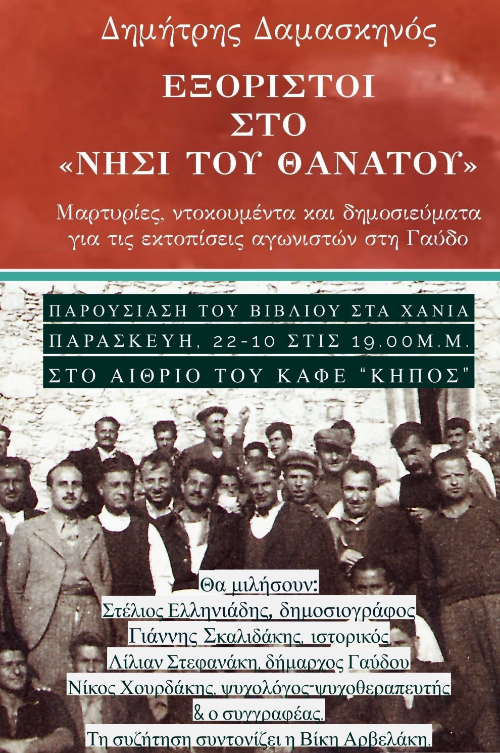 Ο Δήμος Γαύδου, οι εκδόσεις «ΠΑΡΑΣΚΗΝΙΟ»και το βιβλιοπωλείο «ΤΟ ΒΙΒΛΙΟ» σας προσκαλούν την Παρασκευή 22 Οκτωβρίου στις 19.00μ.μ., στην παρουσίαση του ιστορικού βιβλίου του Δημήτρη Δαμασκηνού “Εξόριστοι στο νησί του θανάτου. Μαρτυρίες, ντοκουμέντα και δημοσιεύματα για τις εκτοπίσεις στη Γαύδο”, που θα γίνει στο αίθριο του ιστορικού καφέ “ΚΗΠΟΣ” στα Χανιά.