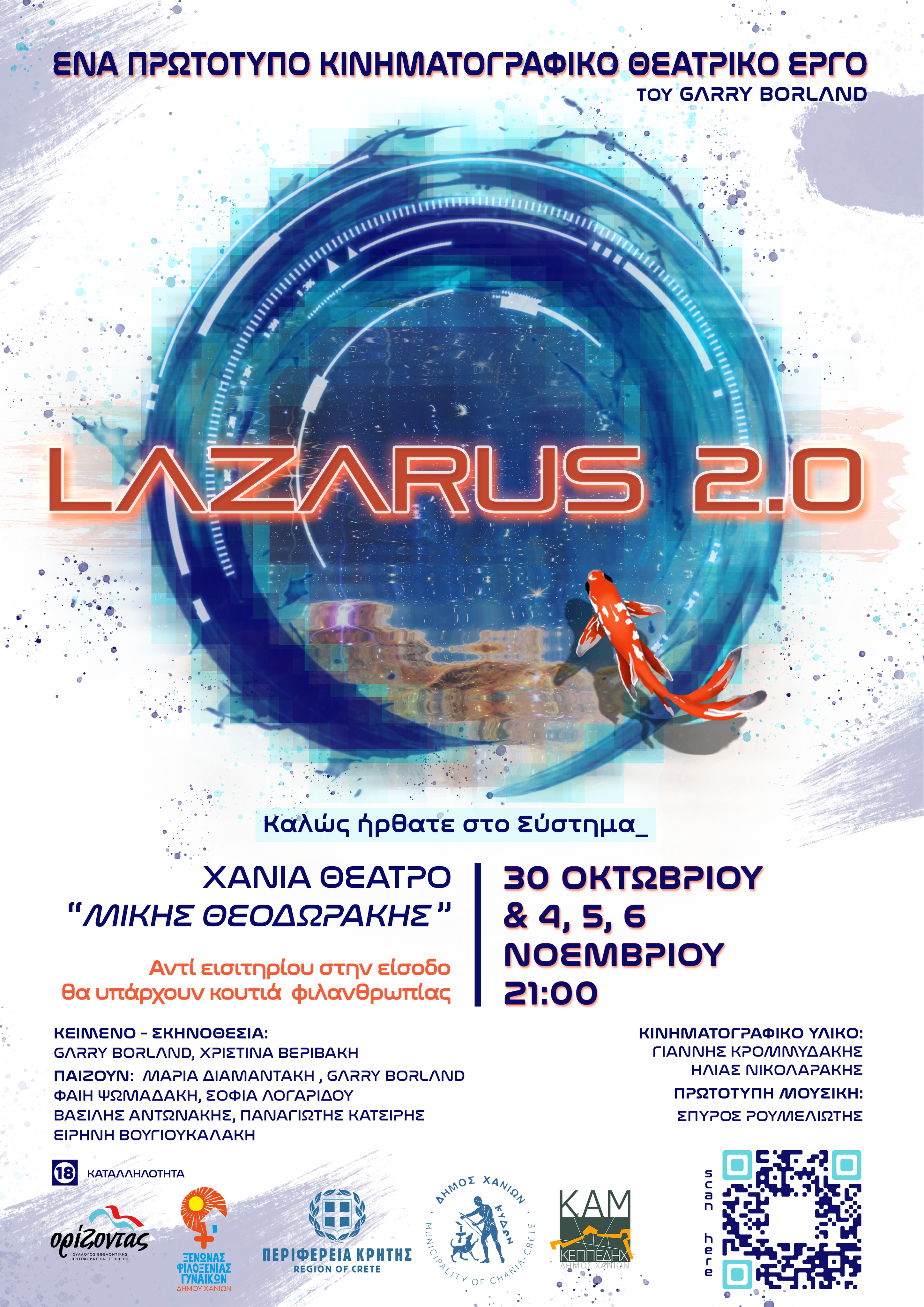 Η ανεξάρτητη θεατρική ομάδα του Gary Borland, σε συνδιοργάνωση με την Περιφερειακή Ενότητα Χανίων και με την ΚΕΠΠΕΔΗΧ ΚΑΜ – Δήμο Χανίων, στο θέατρο Μίκης Θεοδωράκης στις 30 Οκτωβρίου και 4, 5, 6 Νοεμβρίου στις 21:00 παρουσιάζει το πρωτότυπο κινηματογραφικό θεατρικό έργο LAZARUS 2.0 .