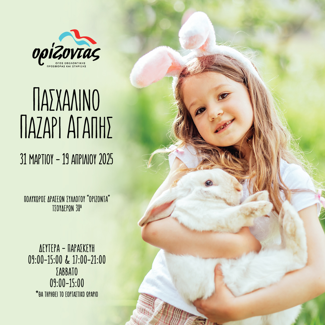 Επισκεφτείτε μας στην οδό Τσουδερών 38Α (πίσω από το 1ο Γυμνάσιο) στον πολυχώρο δράσεων του «Ορίζοντα» και κάντε τις πασχαλινές αγορές σας!
