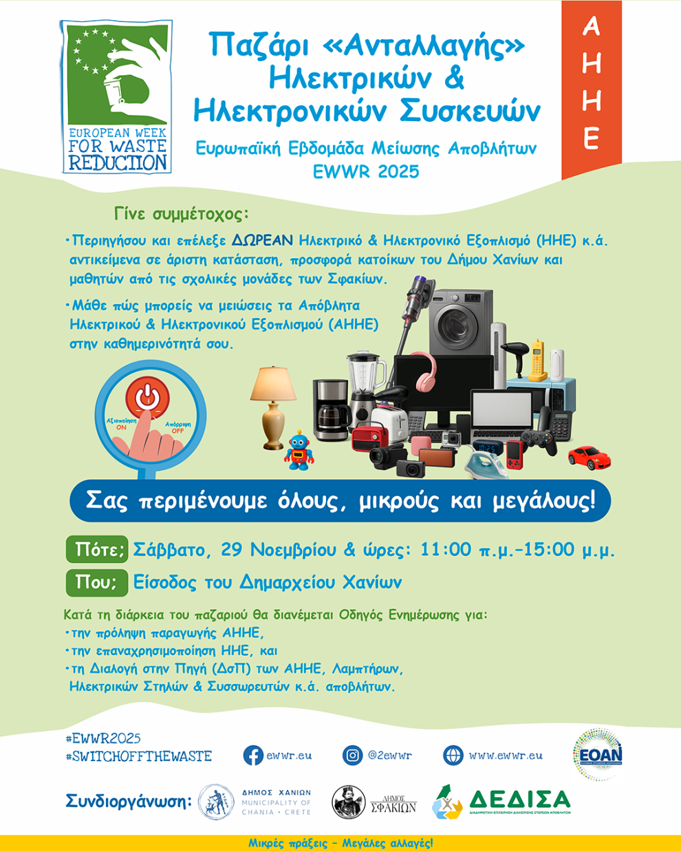 Η Διαδημοτική Επιχείρηση Διαχείρισης Στερεών Αποβλήτων [ΔΕΔΙΣΑ Α.Ε. (ΟΤΑ)] και ο Δήμος Χανίων, προσκαλούν το κοινό στη δράση, ΠΑΖΑΡΙ «Ανταλλαγής» Ηλεκτρικών & Ηλεκτρονικών Συσκευών, που θα πραγματοποιηθεί το Σάββατο 29 Νοεμβρίου 2025, από τις 11:00 έως τις 15:00, έξω από το Δημαρχείο Χανίων (Κυδωνίας 29), στο πλαίσιο της Ευρωπαϊκής Εβδομάδας Μείωσης Αποβλήτων (EWWR 2025), με εθνικό συντονιστή τον Ελληνικό Οργανισμό Ανακύκλωσης (ΕΟΑΝ).