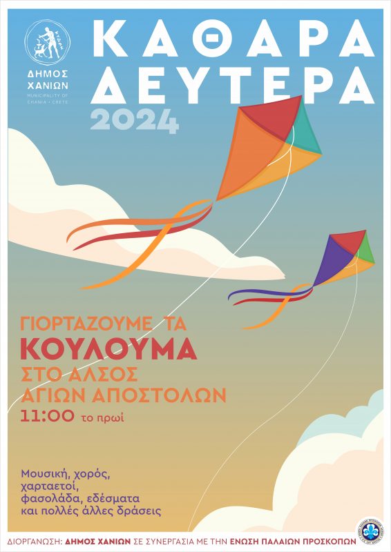 Την Καθαρά Δευτέρα ο Δήμος Χανίων γιορτάζει τα κούλουμα στο άλσος των Αγίων Αποστόλων. Από τις 11 το πρωί θα ξεκινήσει η γιορτή με χορούς, κρητικά και λαϊκά τραγούδια με τον Λεωνίδα Λαινάκη, παραδοσιακά κεράσματα από την Ένωση Παλαιών Προσκόπων Χανίων και άφθονο κρασί (χορηγία του κ.Λεωνίδα Περατσάκη) μέχρι αργά το απόγευμα.