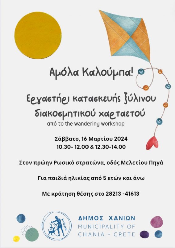 Τα παιδιά θα διασκεδάσουν μαθαίνοντας την ιστορία του χαρταετού και θα κατασκευάσουν τον δικό τους διακοσμητικό ξύλινο χαρταετό. Απαραίτητη η προκράτηση θέσης στο 2821341613 – Γραφείο Πολιτισμού (εργάσιμες ημέρες και ώρες).