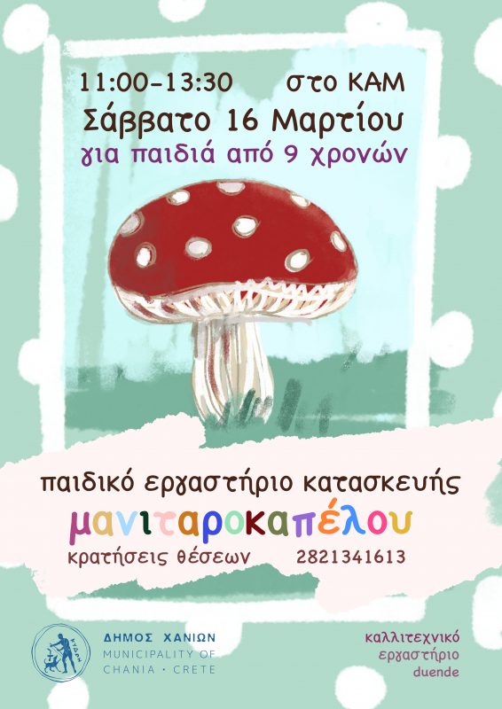 Η συμμετοχή στο εργαστήρι και τα υλικά είναι δωρεάν και αφορά παιδιά από 5 ετών και άνω. Απαραίτητη η προκράτηση θέσης στο 2821341613 – Γραφείο Πολιτισμού (εργάσιμες ημέρες και ώρες).