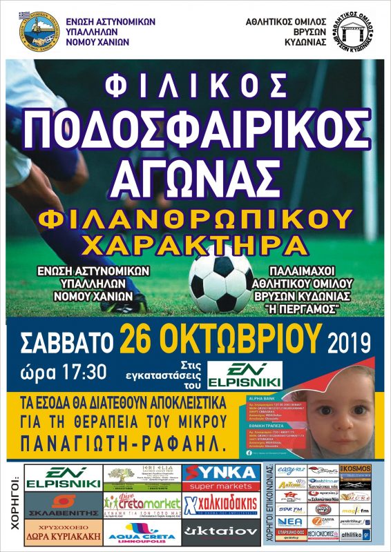 Σας πληροφορούμε ότι το Σάββατο 26 Οκτωβρίου και ώρα 17:30΄ στο Αθλητικό Κέντρο «ELPISNIKI» (οδός 28ης Οκτωβρίου – Νεροκούρου), η Ένωση Αστυνομικών Υπαλλήλων Νομού Χανίων και ομάδα παλαιμάχων του Αθλητικού Ομίλου Βρυσών Κυδωνίας «Πέργαμος» θα διοργανώσουν φιλικό ποδοσφαιρικό αγώνα φιλανθρωπικού χαρακτήρα.