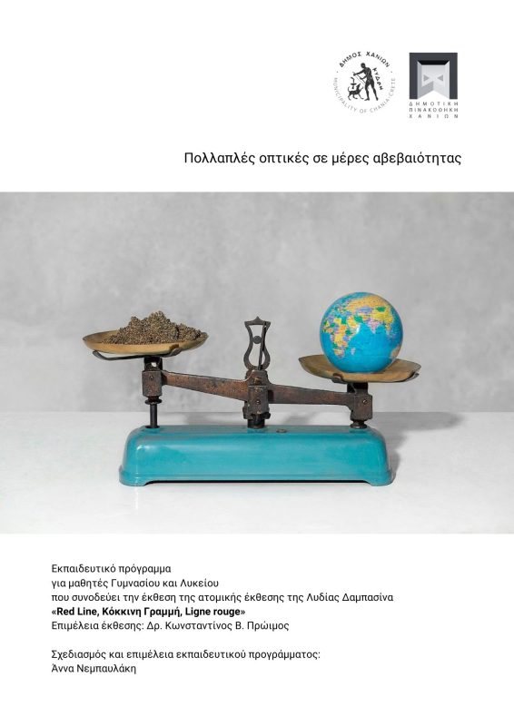 Η Δημοτική Πινακοθήκη και ο Δήμος Χανίων, με τη στήριξη της Διεύθυνσης Δευτεροβάθμιας Εκπαίδευσης Χανίων, καλούν σχολικές ομάδες Γυμνασίων και Λυκείων να συμμετάσχουν στο εκπαιδευτικό πρόγραμμα, που συνοδεύει την ατομική έκθεση της Λυδίας Δαμπασίνα «Red Line, Κόκκινη Γραμμή, Ligne rouge», σε επιμέλεια του επίκουρου καθηγητή στο Πανεπιστήμιο Πατρών και κριτικού τέχνης, δρ. Κωνσταντίνου Β. Πρώιμου.