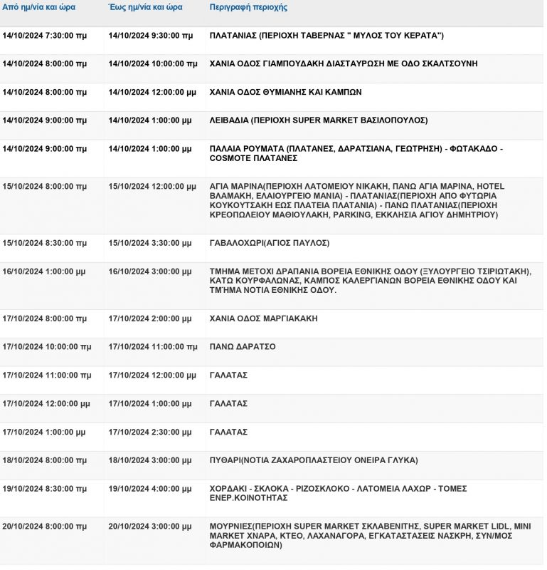 Δείτε αναλυτικά τις περιοχές και τις ώρες κατά τις οποίες θα διακοπεί η ηλεκτροδότηση.