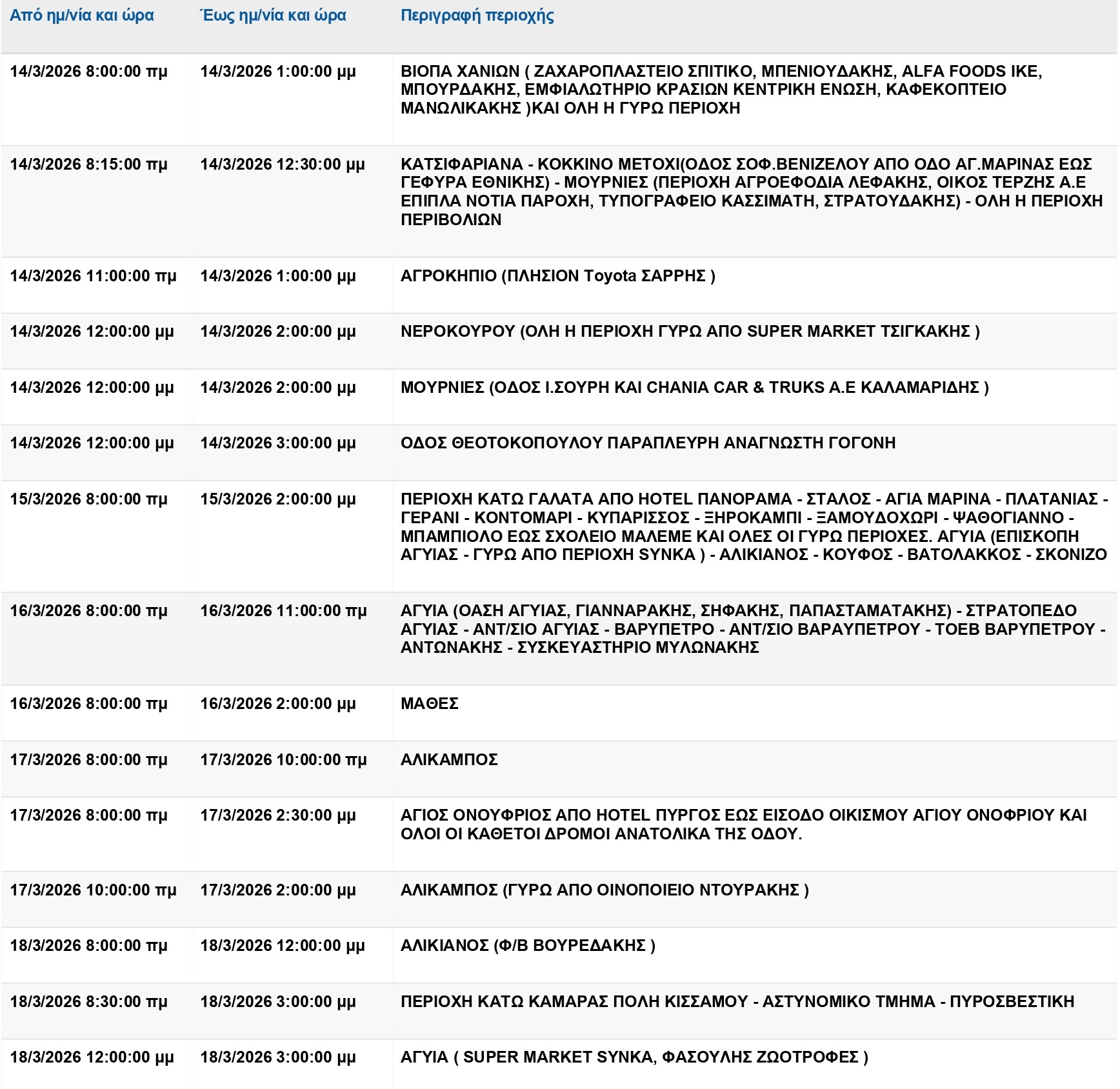 Ειδοποιούνται οι κάτοικοι των παρακάτω περιοχών ότι για να εκτελεστούν απαραίτητες τεχνικές εργασίες στο δίκτυο, θα γίνει διακοπή του ηλεκτρικού ρεύματος.