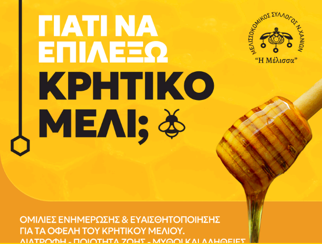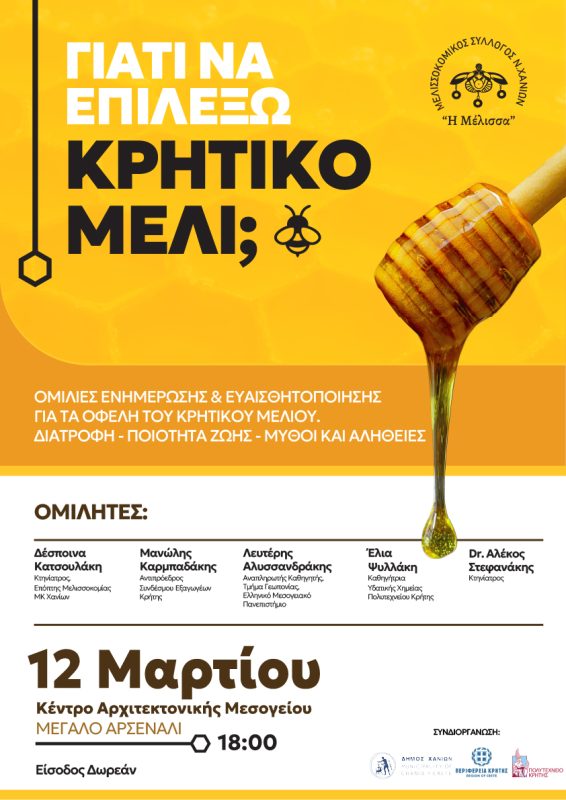 Ο Μελισσοκομικός Σύλλογος Ν. Χανίων «Η ΜΕΛΙΣΣΑ» διοργανώνει εσπερίδα, για την ενημέρωση του καταναλωτή και την ανάδειξη της ανωτερότητας του Κρητικού μελιού, στο Μεγάλο Αρσενάλι, την Τετάρτη 12 Μαρτίου και ώρα 18:00 μ.μ, με τους παρακάτω ομιλητές: