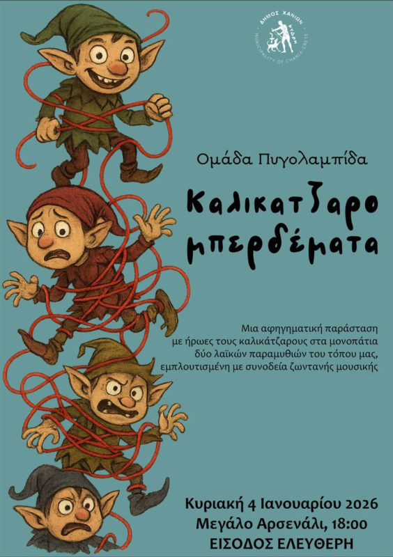 Μια αφηγηματική παράσταση με ήρωες τους καλικάντζαρους στα μονοπάτια δύο λαϊκών παραμυθιών του τόπου μας, εμπλουτισμένη με συνοδεία ζωντανής μουσικής.
