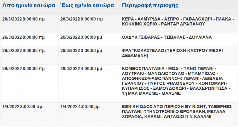Αν οι εργασίες τελειώσουν νωρίτερα, το ρεύμα θα ξαναδοθεί πριν από τον χρόνο λήξης της διακοπής που αναφέρεται πιο κάτω.