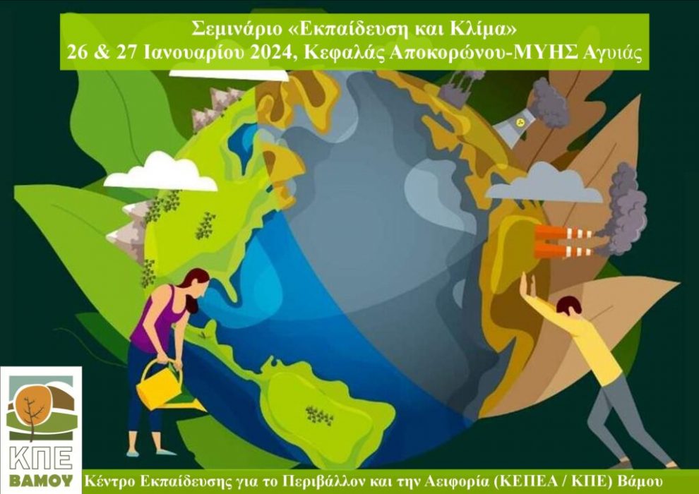 Το Κέντρο Εκπαίδευσης για το Περιβάλλον και την Αειφορία Βάμου, σε συνεργασία με τους Υπεύθυνους Σχολικών Δραστηριοτήτων των Διευθύνσεων της Περιφερειακής Διεύθυνσης Εκπαίδευσης Κρήτης, στα πλαίσια του Περιφερειακού Θεματικού Δικτύου Π.Ε. «Αλλά..Ζω για το Κλίμα» οργανώνει διήμερο σεμινάριο την Παρασκευή 26 και το Σάββατο 27 Ιανουαρίου.