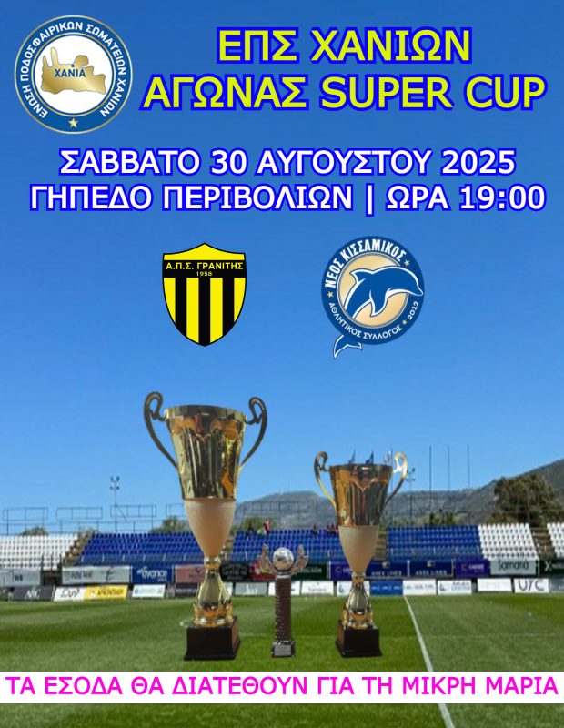 O τελικός του Super Cup της ΕΠΣ Χανίων 2025, ανάμεσα στον πρωταθλητή της Α’ Κατηγορίας Γρανίτη και τον κυπελλούχο Νέο Κισαμικό θα διεξαχθεί στο Δημοτικό Γήπεδο Περιβολίων το Σάββατο 30 Αυγούστου και ώρα 7 μ.μ.