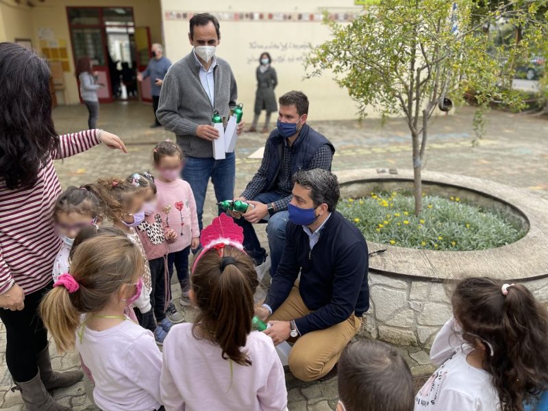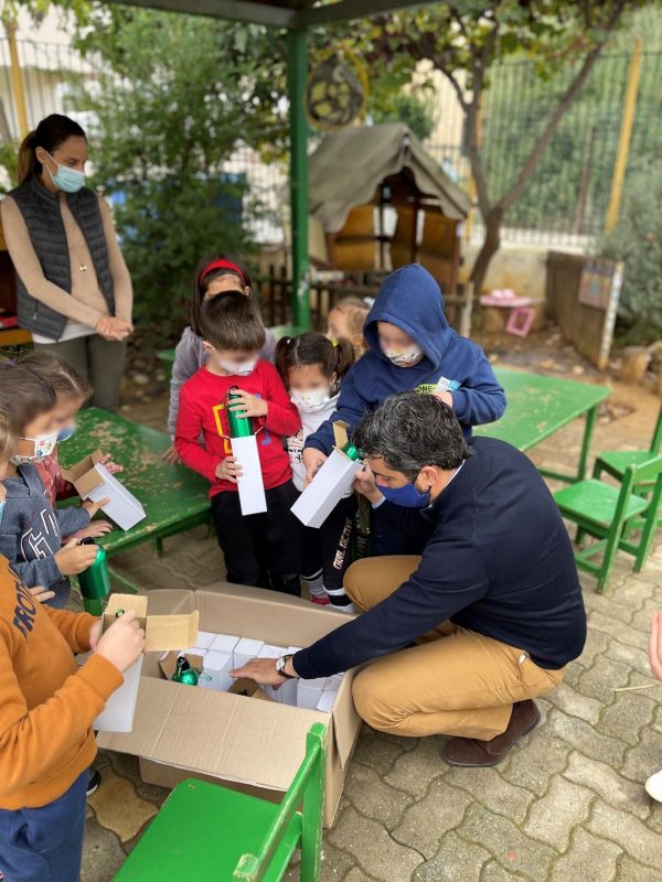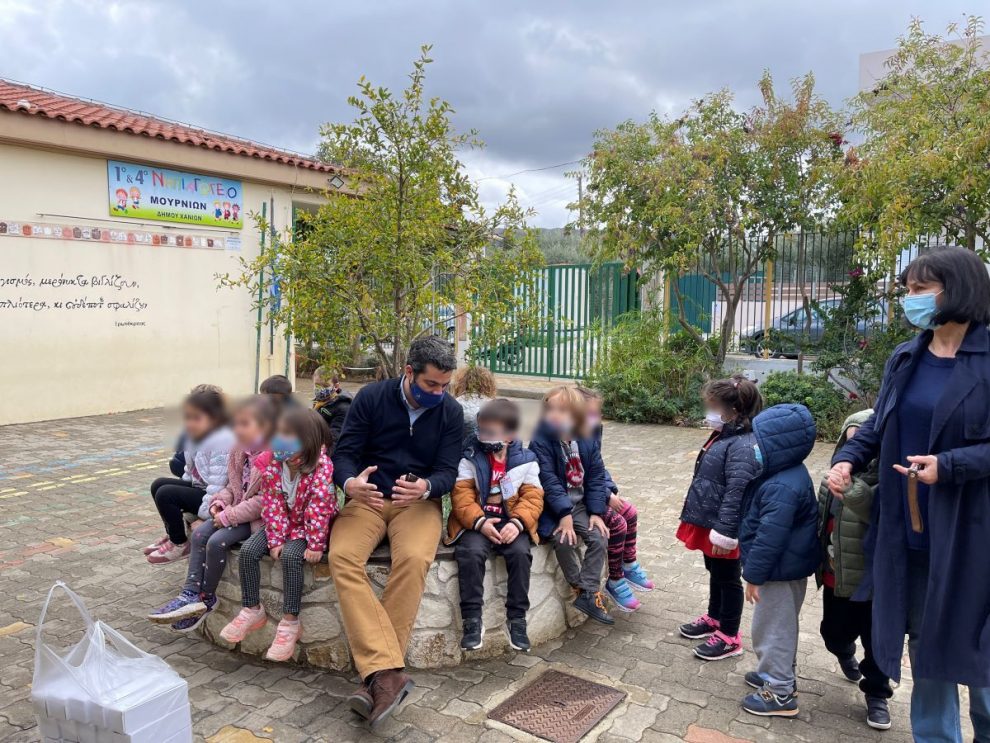 Ο Δήμαρχος Χανίων συνομίλησε με τα παιδιά του Νηπιαγωγείου και στη συνέχεια αφού ενημερώθηκε για τις δράσεις του σχολείου από τους ίδιους τους μικρούς μαθητές, είχε την ευκαιρία να μοιράσει σε όλους επαναχρησιμοποιούμενα μεταλλικά παγούρια νερού.