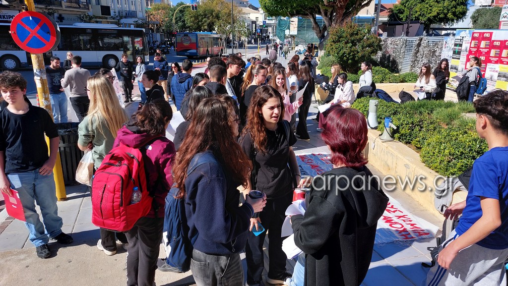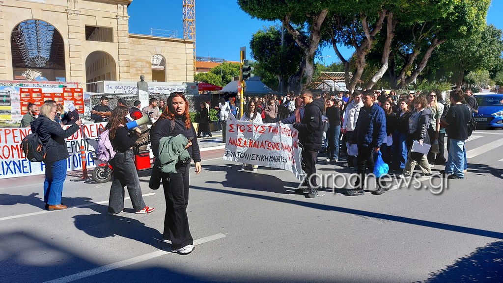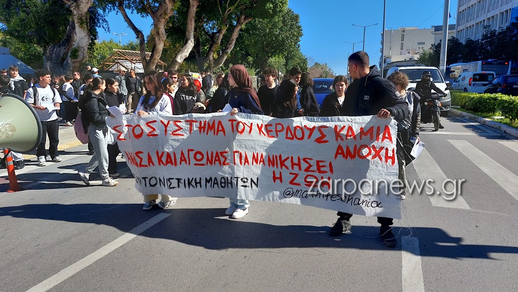 Οι μαθητές των Χανίων με σύνθημά τους ”Στο σύστημα του κέρδους καμία ανοχή – Ανάσα και αγώνας για να κερδίσει η ζωή” διεκδικούν ένα σύστημα παιδείας δίκαιο για όλους και αντιτίθενται στο Εθνικό Απολυτήριο.