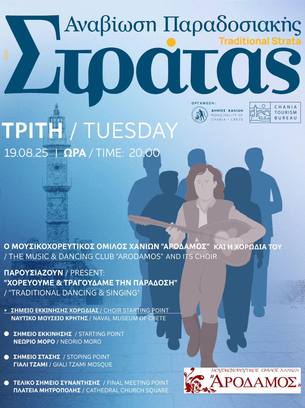 Αύριο, Τρίτη 19/08/2025 ο μουσικοχορευτικός Σύλλογος Χανίων «ΑΡΟΔΑΜΟΣ» & η χορωδία του θα παρουσιάσουν το δρώμενο: «Χορεύουμε & τραγουδάμε την παράδοση». Η διαδρομή της στράτας θα ξεκινήσει στις 20.00. Σημείο εκκίνησης χορωδίας,Ναυτικό Μουσείο Κρήτης, σημείο εκκίνησης χορευτών, Νεώριο Μόρο, στάση στο Γιαλί Τζαμί και τελικό σημείο συνάντησης στην Πλατεία Μητρόπολης.