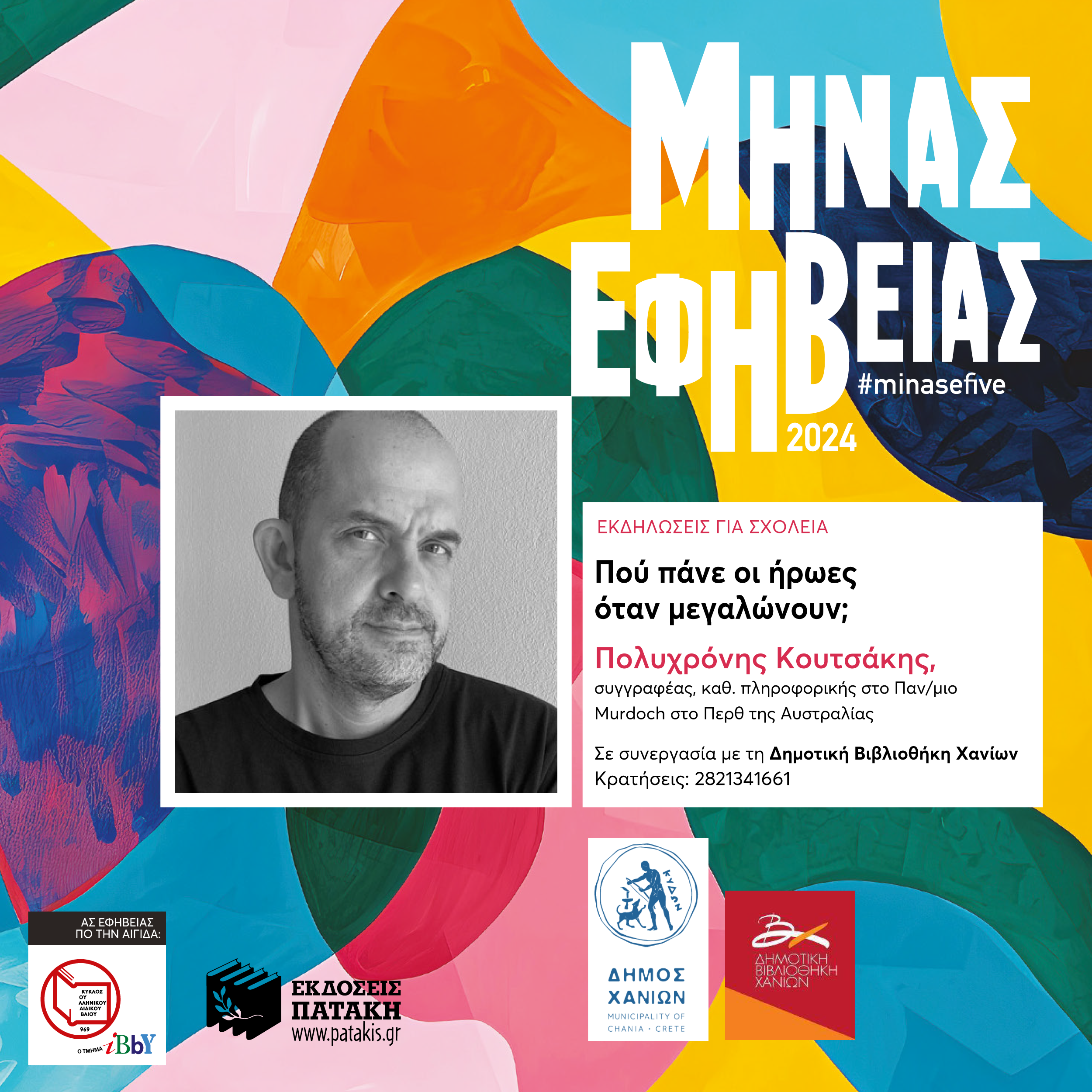 Με αφορμή το νέο αστυνομικό μυθιστόρημα του συγγραφέα, καθηγητή Πληροφορικής, Πολυχρόνη Κουτσάκη, «Κάτι σαν αγάπη» και τον «Μήνα Εφηβείας», που υλοποιείται στη Δημοτική Βιβλιοθήκη Χανίων, θα πραγματοποιηθεί συζήτηση με τον συγγραφέα και μαθητές. Η συζήτηση θα επικεντρωθεί στο πώς νιώθουν οι μαθητές ότι ο χρόνος αλλάζει τις ζωές τους, πώς ονειρεύονται το δικό τους μέλλον σε λίγα χρόνια από σήμερα, αν θέλουν να ζήσουν σε άλλα μέρη ή να μείνουν στον τόπο τους, καθώς και αν γνωρίζουν ή αν έχουν ζήσει επικίνδυνες περιπέτειες.