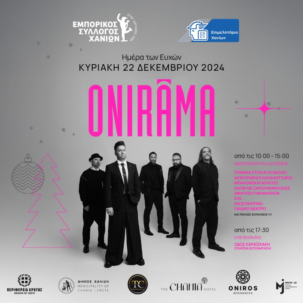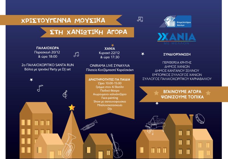 Το Επιμελητήριο Χανίων παρουσιάζει τις εορταστικές εκδηλώσεις που διοργανώνει τις επόμενες ημέρες με τίτλο «Χριστούγεννα Μουσικά στη Χανιώτικη Αγορά» και τη συμμετοχή σημαντικών καλλιτεχνών με πλούσιες δράσεις για όλη την Οικογένεια. Στρατηγική προτεραιότητα η έμπρακτη στήριξη των εμπορικών Αγορών της Περιφερειακής Ενότητας Χανίων, όπως αποτυπώνεται και στο σύνθημα των πολυδιάστατων δράσεων: «Βγαίνουμε Αγορά-Ψωνίζουμε Τοπικά!».