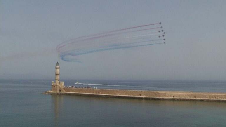Εντυπωσίασαν για ακόμα μια φορά τα “Κόκκινα Βέλη” (Red Arrows) της Βρετανικής Πολεμικής Αεροπορίας με τους θεαματικούς ελιγμούς και τις απίστευτες φιγούρες τους πολλούς Έλληνες και ξένους επισκέπτες, που βρέθηκαν στο Ενετικό λιμάνι των Χανίων.