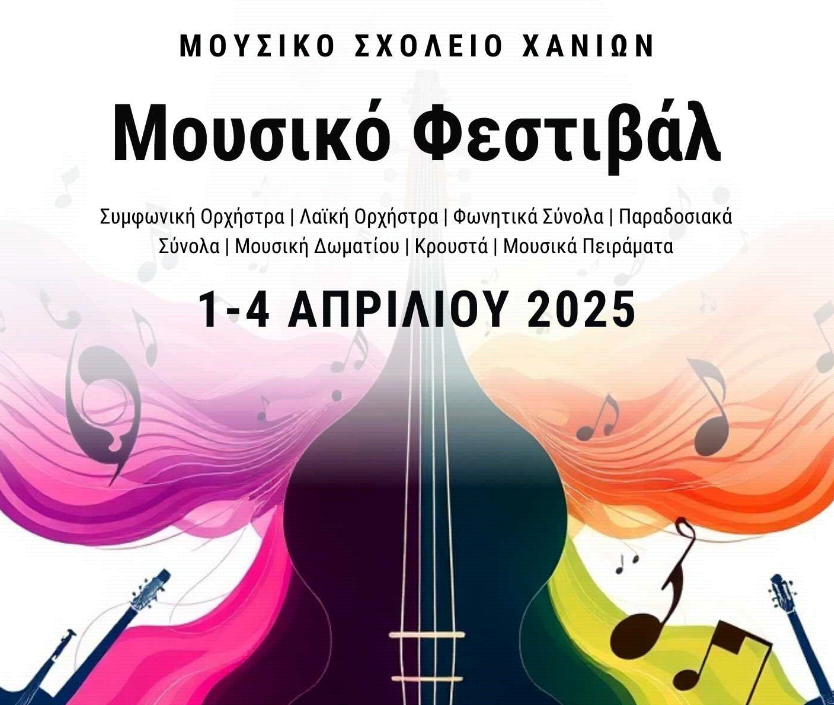 Το Μουσικό Σχολείο Χανίων, με τη συνδιοργάνωση της Περιφέρειας Κρήτης – Περιφερειακή Ενότητα Χανίων και του Δήμου Χανίων, διοργανώνει ΜΟΥΣΙΚΟ ΦΕΣΤΙΒΑΛ από την Τρίτη 1η Απριλίου 2025 έως και την Παρασκευή 4 Απριλίου 2025, στο Πνευματικό Κέντρο Χανίων.