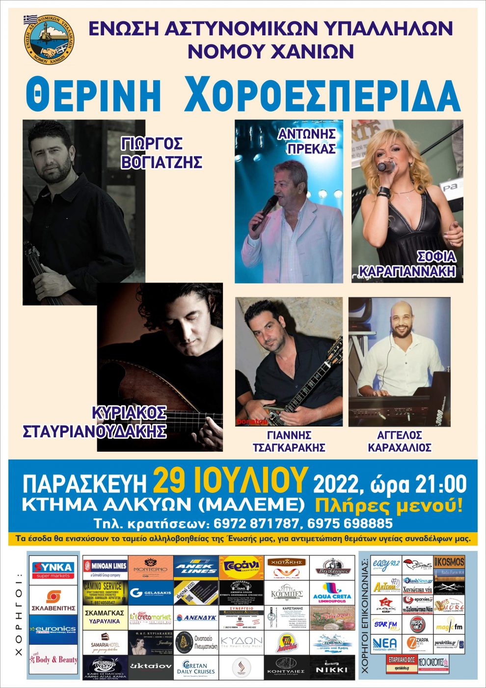 Την Παρασκευή 29 Ιουλίου 2022 και ώρα 21:00΄ στο «Κτήμα Αλκυών» στο Μάλεμε Χανίων, η Ένωση Αστυνομικών Υπαλλήλων Νομού Χανίων θα πραγματοποιήσει θερινή χοροεσπερίδα.