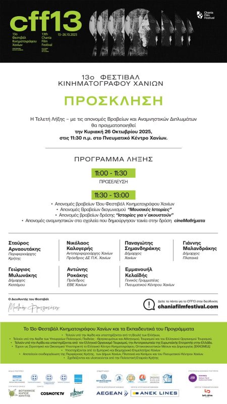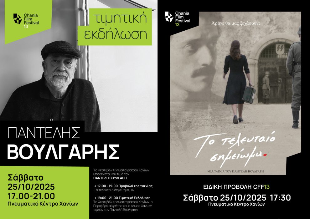Τιμητική εκδήλωση για τον Παντελή Βούλγαρη στο 13ο Φεστιβάλ Κινηματογράφου Χανίων, το Σάββατο 25 Οκτωβρίου: