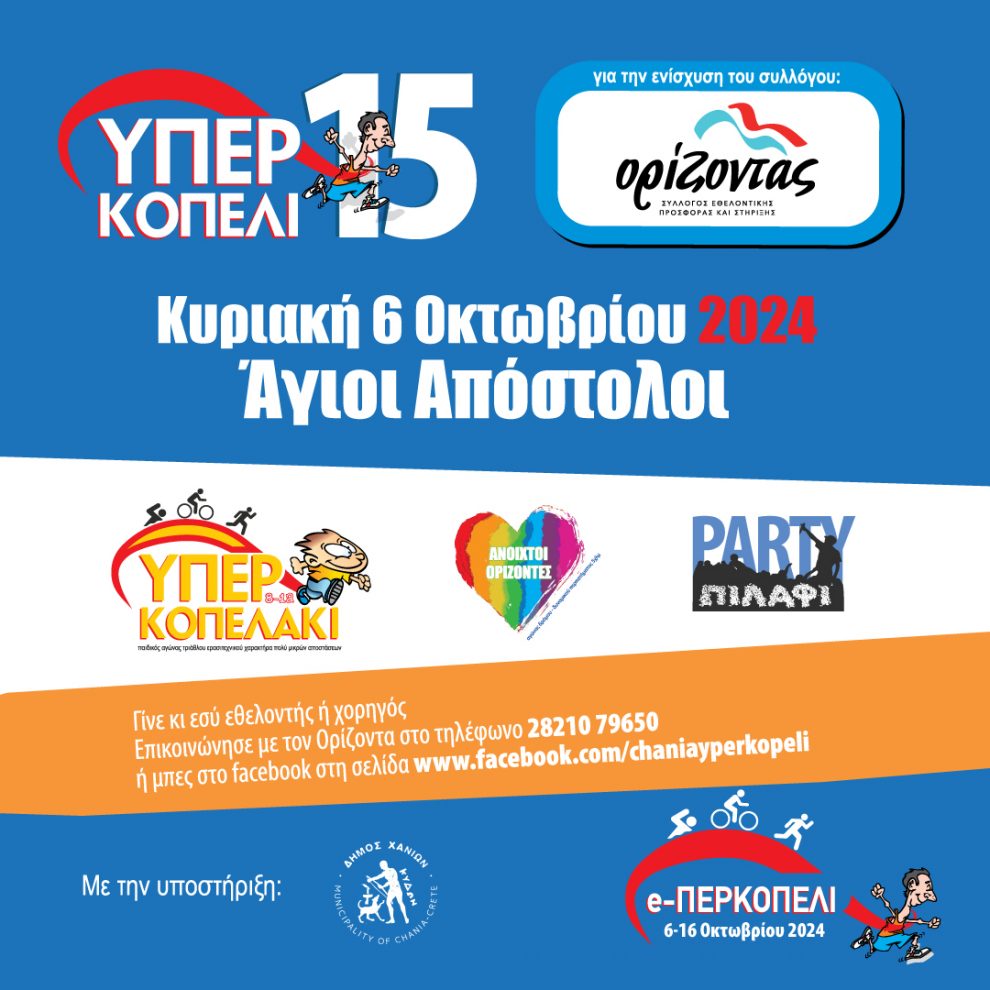 Την Κυριακή 6 Οκτωβρίου ξεκινάμε με τους αγαπημένους σε όλους μας πια αγώνες του Υπερκοπελιού: το «Υπερκοπελάκι» στις 11:00 και το «Υπερκοπέλι» στις 12:30, αγώνες τριάθλου ερασιτεχνικού χαρακτήρα για μικρούς και μεγάλους. Ένας αγώνας αλλιώτικος από τους άλλους, ένας «αγώνας για τη ζωή», με σκοπό τη συμμετοχή και όχι τη νίκη, χωρίς κατακτήριες θέσεις και επίσημη χρονομέτρηση. Το απόγευμα της ίδιας ημέρας στις 17:00, θα διεξαχθούν οι «Ανοιχτοί Ορίζοντες», ένας αγώνας δρόμου δυναμικού περπατήματος 5χλμ, χωρίς χρονομέτρηση και κατάταξη, στον οποίον οι συμμετέχοντες θα προσφέρουν το κόστος της συμμετοχής τους (5 ευρώ) σε όποιο σωματείο/ίδρυμα επιθυμούν (θα ανακοινωθούν άμεσα τα συμμετέχοντα σωματεία), με σκοπό να προωθηθεί το μήνυμα του εθελοντισμού.