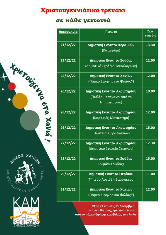 Ο Δήμος Χανίων έχει προγραμματίσει γιορτινά δρομολόγια με το Χριστουγεννιάτικο τρενάκι και περιμένει μικρούς και μεγάλους για να ξεκινήσει τις βόλτες του, εντελώς δωρεάν.