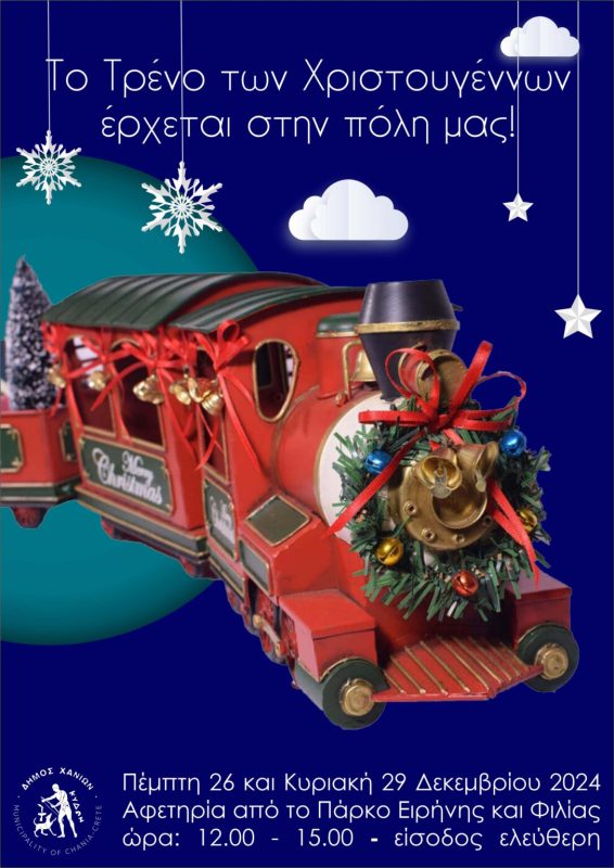 Την Κυριακή 29 Δεκεμβρίου το Χριστουγεννιάτικο Τρενάκι θα μας ταξιδέψει στους δρόμους και στις πλατείες της πόλης μας, μεταφέροντας τη χαρά και τη μαγεία του εορταστικού πνεύματος! Το Χριστουγεννιάτικο Τρενάκι της πόλης θα βρίσκεται μαζί μας από τις 12.00 έως τις 15.00, με αφετηρία και τερματισμό τo πάρκο Ειρήνης και Φιλίας.