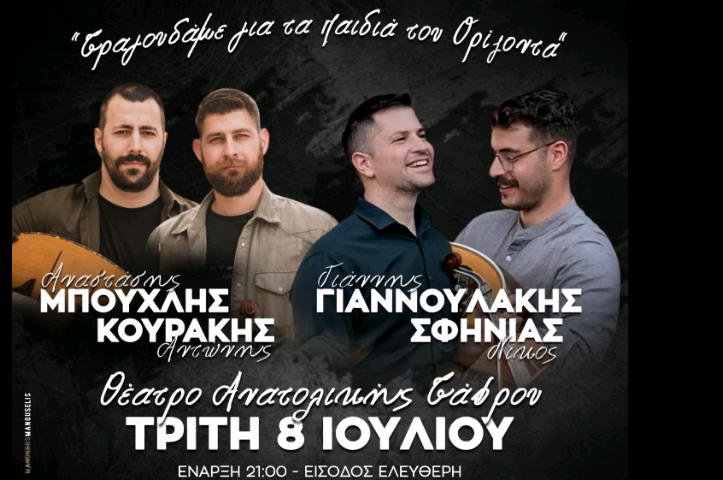 Η Ένωση Σφακιανών Ν. Χανίων, σε συνδιοργάνωση με τον Σύλλογο Μακεδόνων – Θρακών Ν. Χανίων “Μέγας Αλέξανδρος”, την Περιφέρεια Κρήτης – Περιφερειακή Ενότητα Χανίων και τον Δήμο Χανίων, σας προσκαλούν σε μια ιδιαίτερη μουσικοχορευτική εκδήλωση με τίτλο: «Τραγουδάμε για τα παιδιά του Ορίζοντα».