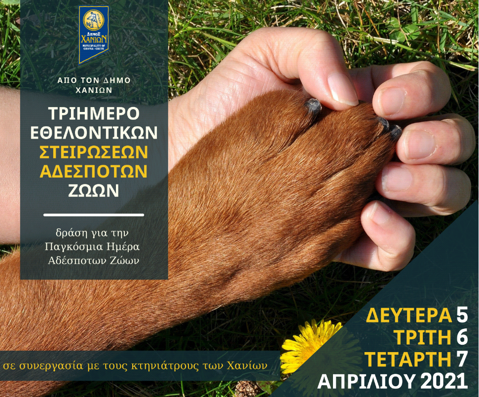 Ο Δήμος Χανίων γιορτάζει την Παγκόσμια Ημέρα Αδέσποτων ζώων (4 Απριλίου), με διαφορετικές δράσεις ευαισθητοποίησης του κοινού και αποτελεσματικής φροντίδας στα ζώα που βρίσκονται στους δρόμους.