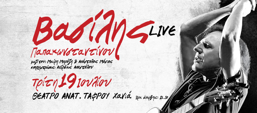 Την Τρίτη 19 Ιουλίου 2022 ο Βασίλης Παπακωνσταντίνου θα μας χαρίσει μια μοναδική συναυλία στο Θέατρο Ανατολικής Τάφρου στα Χανιά.