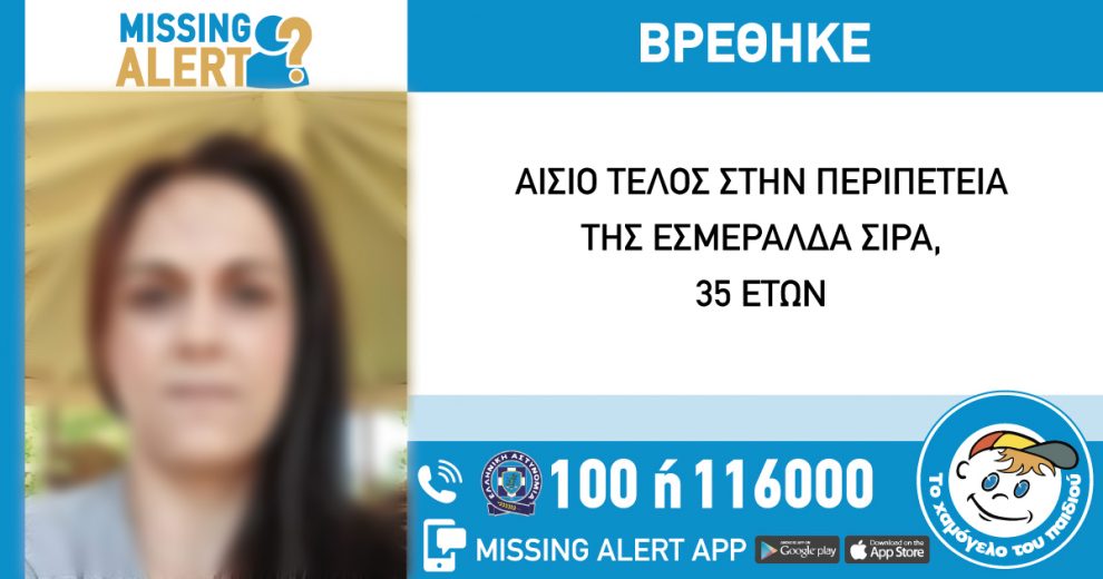 Η περιπέτεια της Εσμεράλδα Σίρα, 35 ετών, έληξε το βράδυ του Σαββάτου 18 Δεκεμβρίου δίνοντας τέλος στην αγωνία των δικών της ανθρώπων που την αναζητούσαν.