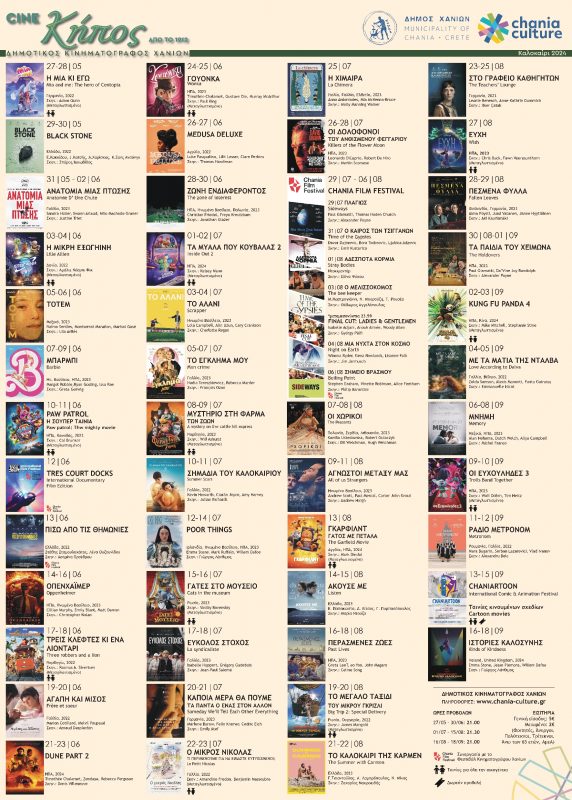 από 27/05 έως και 30/06: 21:00από 01/07 έως και 15/08: 21:30από 16/08 έως και 18/09: 21:00Αναλυτικές πληροφορίες για τις ταινίες, το πρόγραμμα και τις προβολές βρείτε εδώ:www.chania-culture.gr